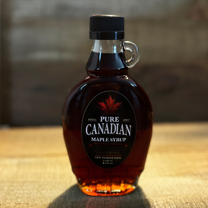 Canadian pure maple syrup, known for its rich, smooth taste and natural sweetness.