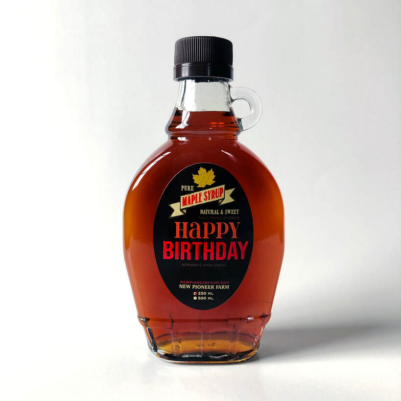 A bottle of our pure maple syrup, labeled for birthdays and ready to gift.